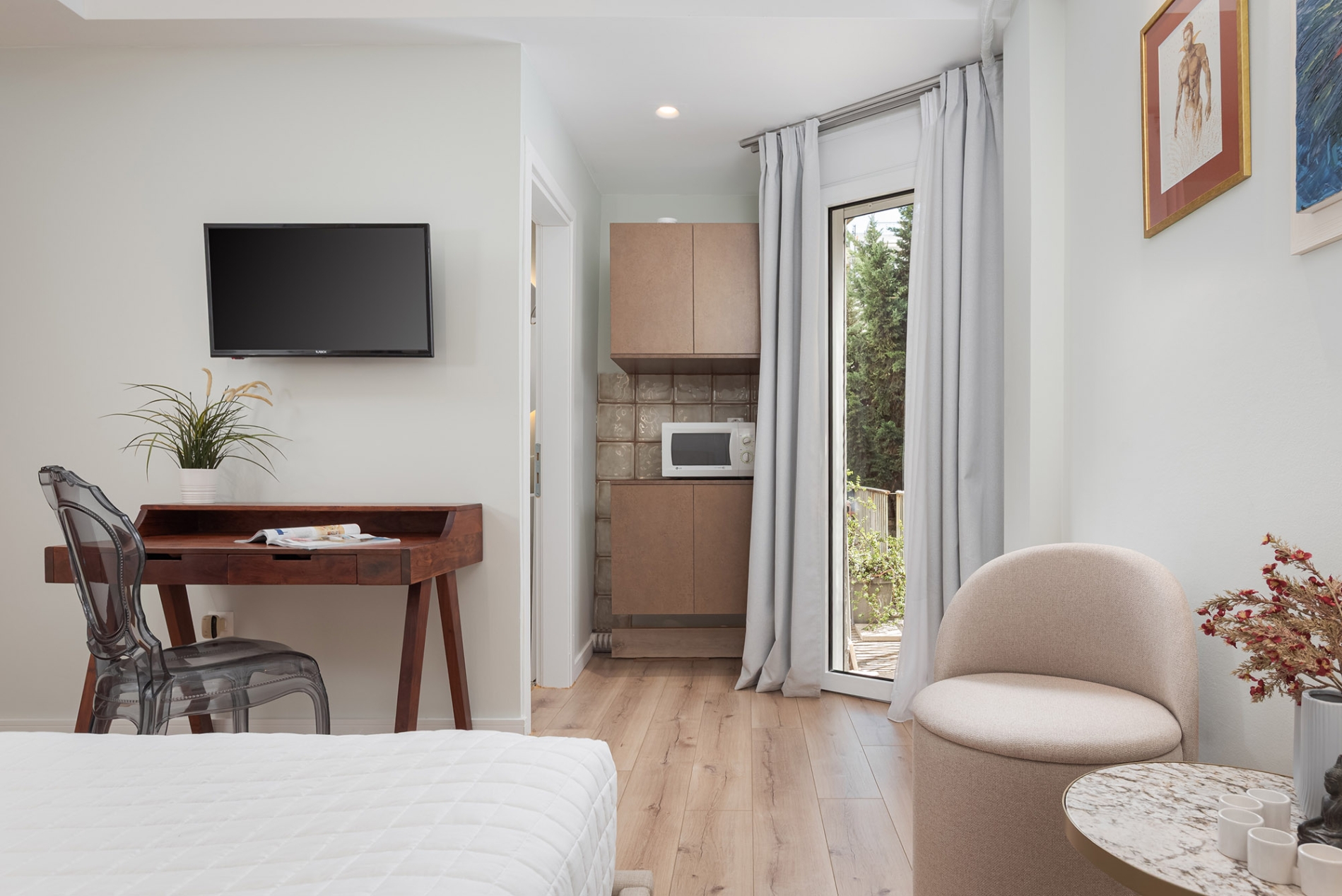 The balcony, with city view, completes the tranquil atmosphere, making the Artemis Apartment a perfect blend of simplicity, comfort, and understated elegance.