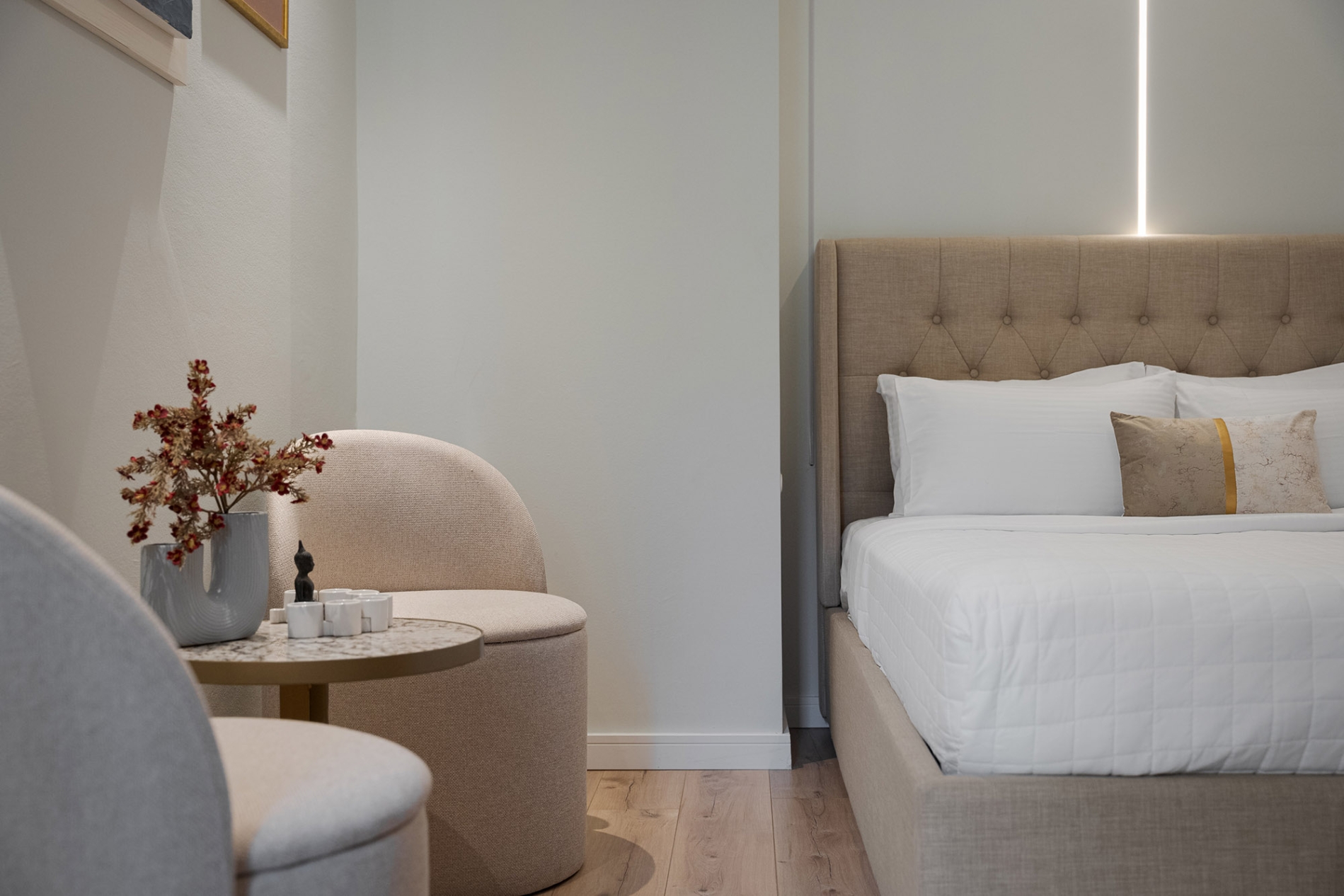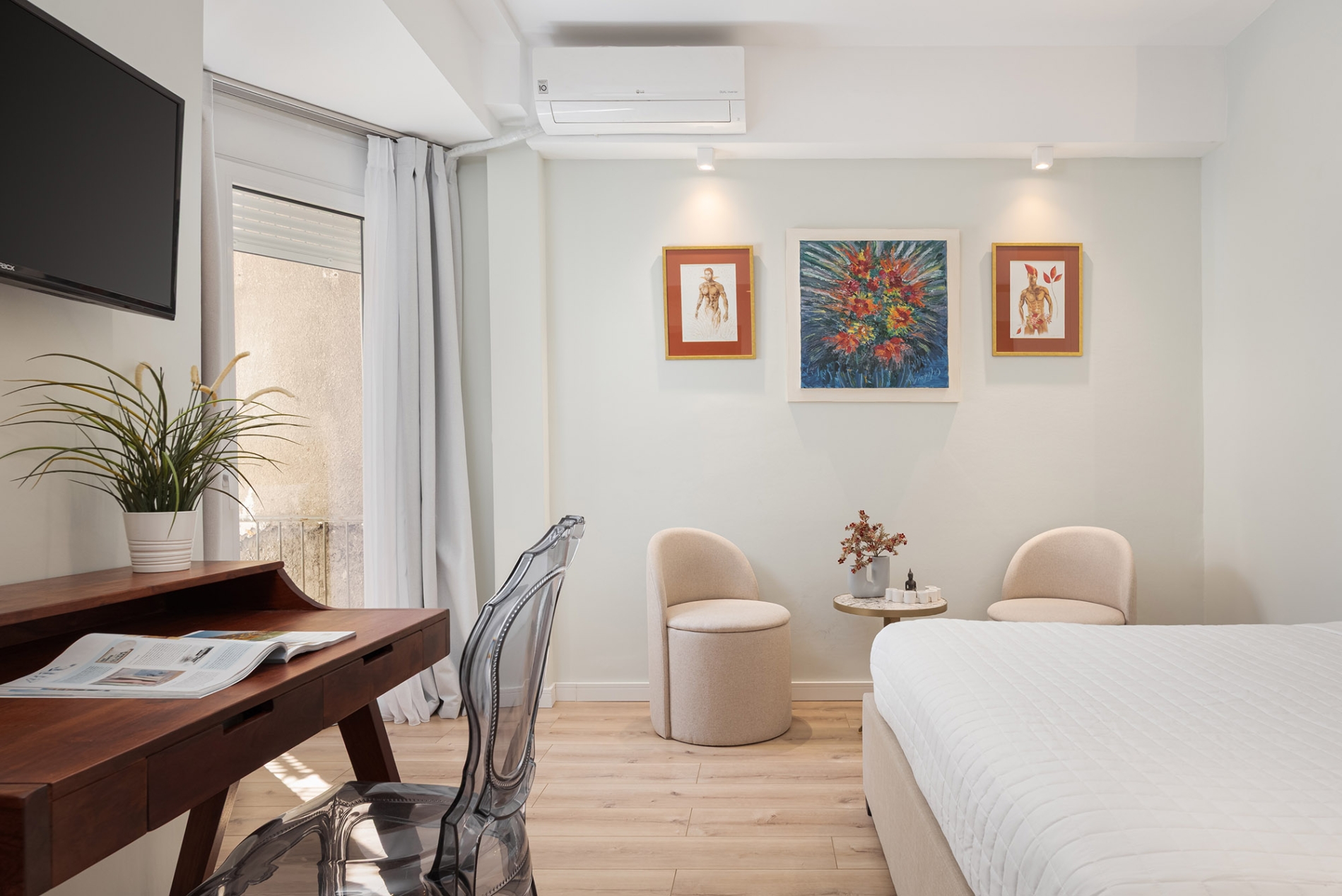 The balcony, with city view, completes the tranquil atmosphere, making the Artemis Apartment a perfect blend of simplicity, comfort, and understated elegance.
