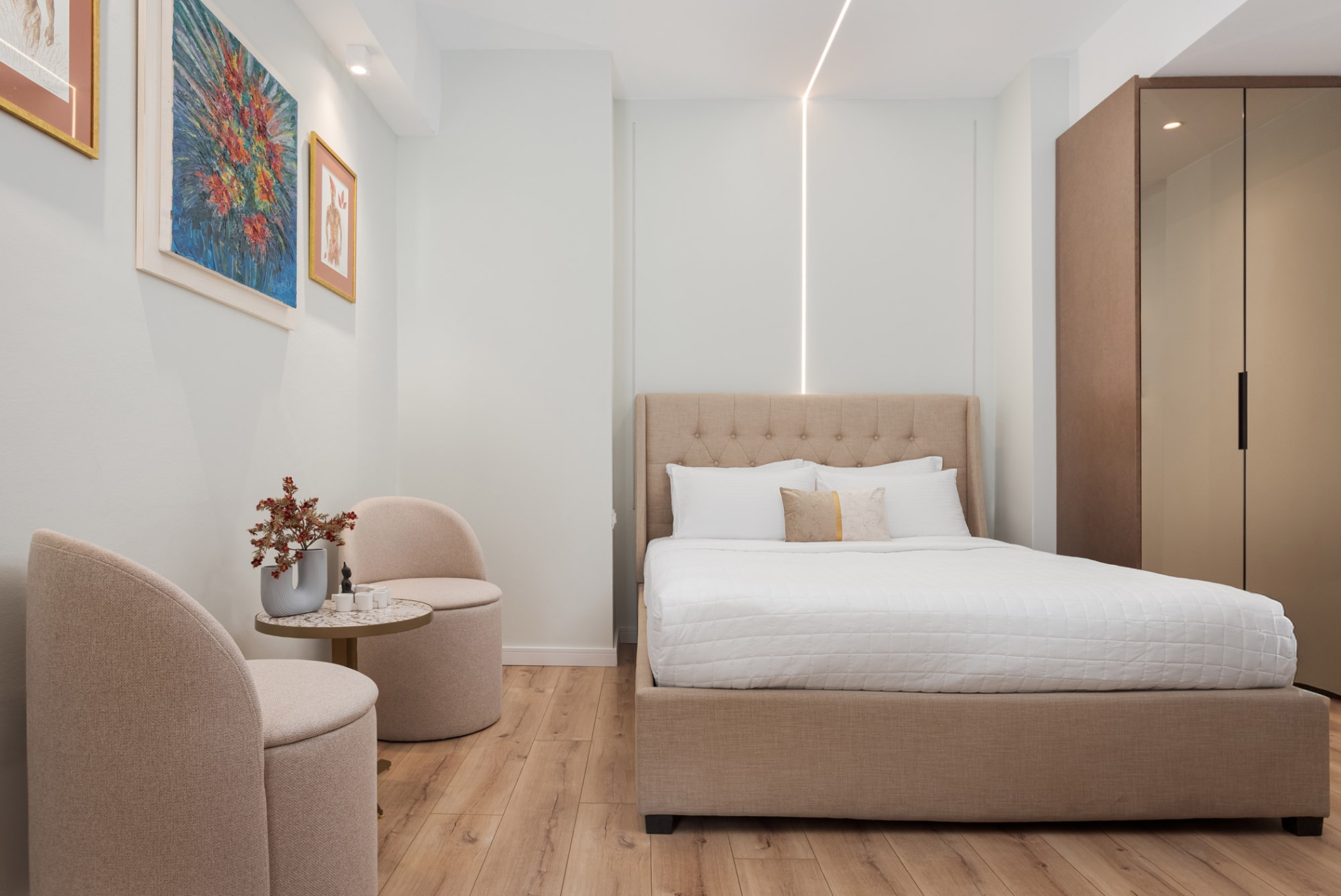 The Artemis Apartment, covering 25 sq.m., is an elegant and serene retreat, ideal for couples, friends, or solo travelers.