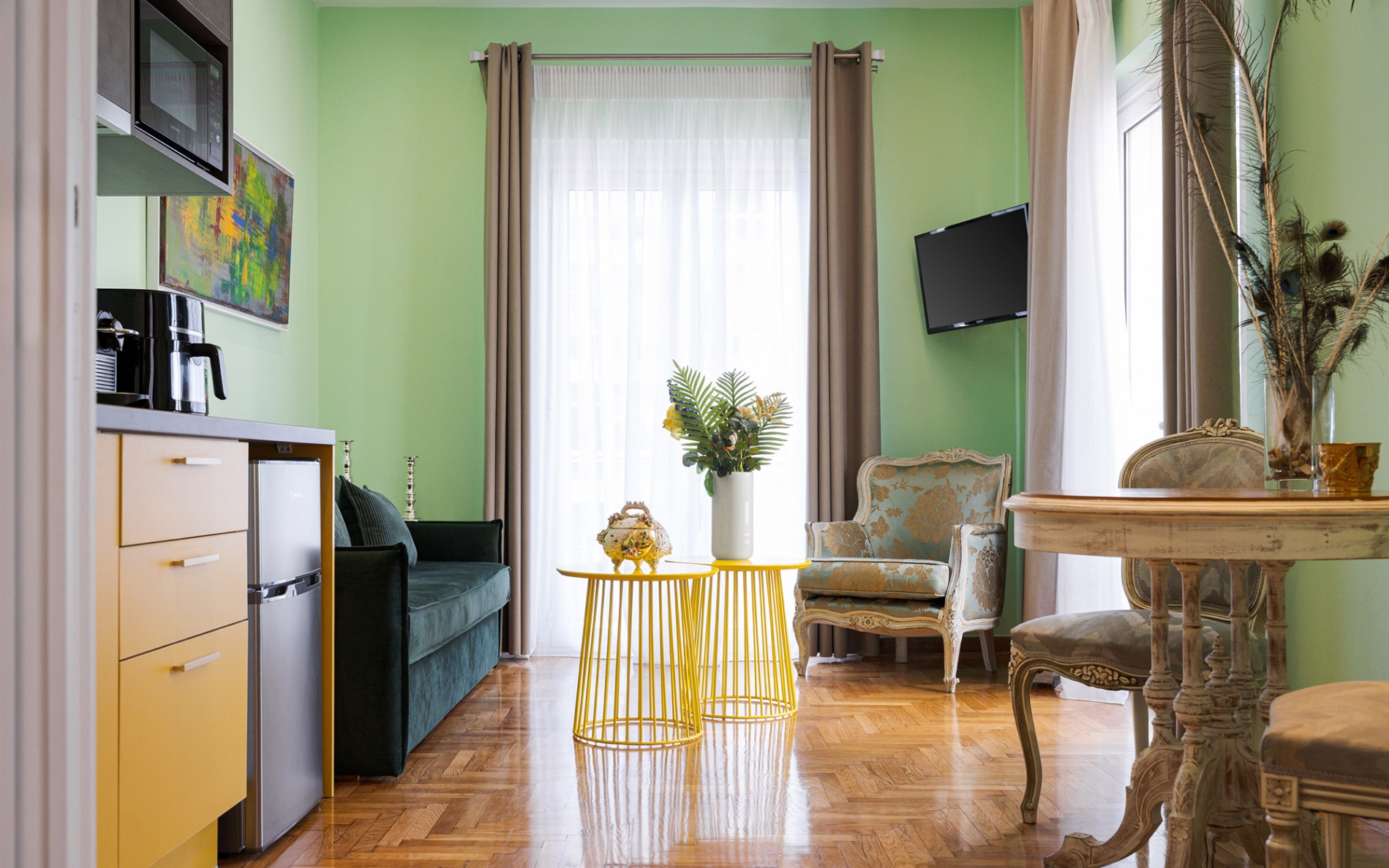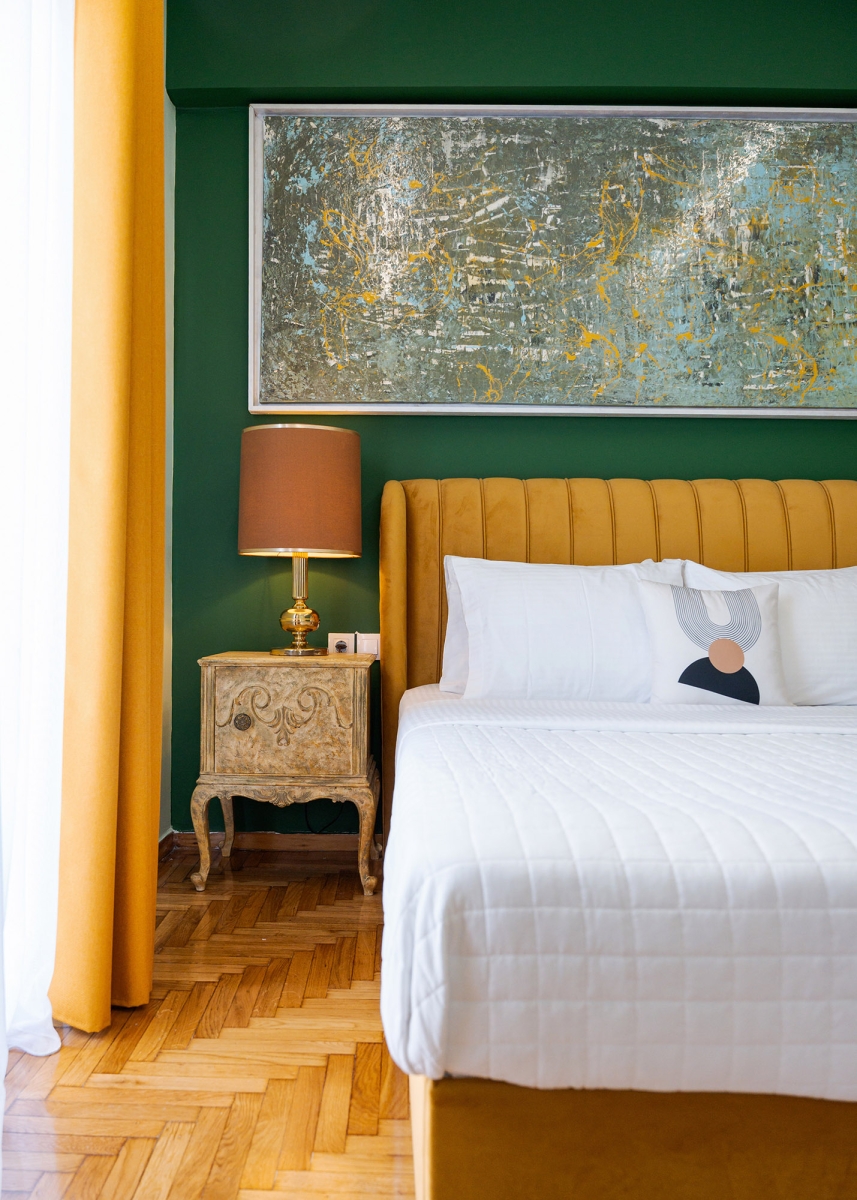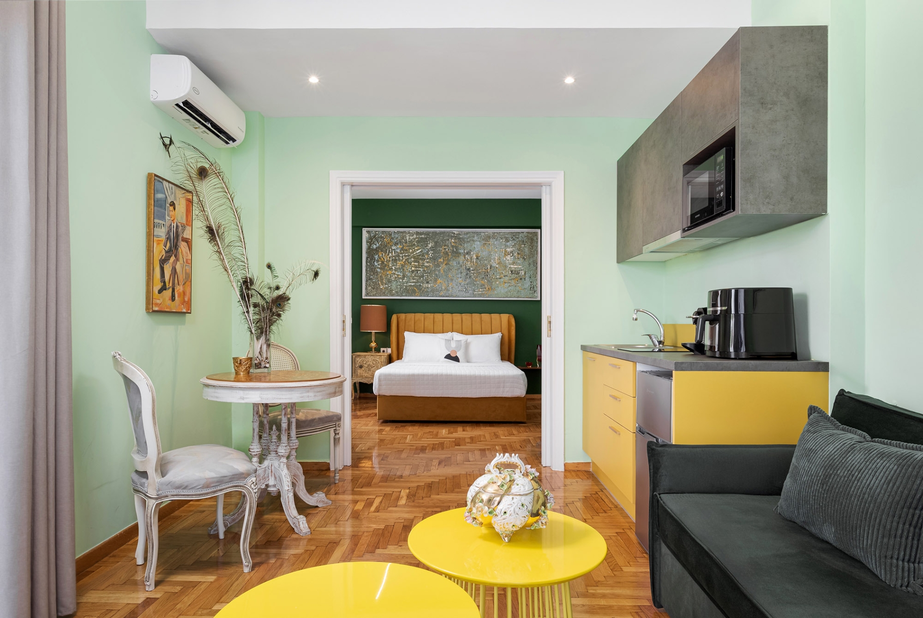 The Hermes City Apartment, covering 36 sq.m., radiates color, character, and contemporary charm.